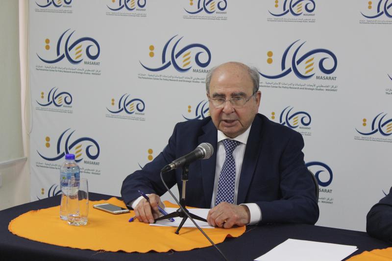 وأكد على صوابية الموقف الفلسطيني من التعامل مع ما يسمى "صفقة القرن"، بما في ذلك رفض العودة إلى الصيغة التفاوضية السابقة تحت الرعاية الأميركية. ودعا إلى مراجعة معايير وسياسات المرحلة الماضية، والتفكير خارج الصندوق واتباع نهج جديد، انطلاقا من دراسة مختلف السيناريوهات وتحديد الخيارات الفلسطينية الأكثر جدوى، بما يتطلبه ذلك من وضع كل شيء على طاولة البحث، بما في ذلك حل السلطة أو استقالة الرئيس، وما اليوم التالي لذلك، أو إعطاء الأولوية للمواجهة السياسية مع الإدارة الأميركية أو المواجهة السياسية مع إسرائيل ومخططاتها، أو مع كليهما.