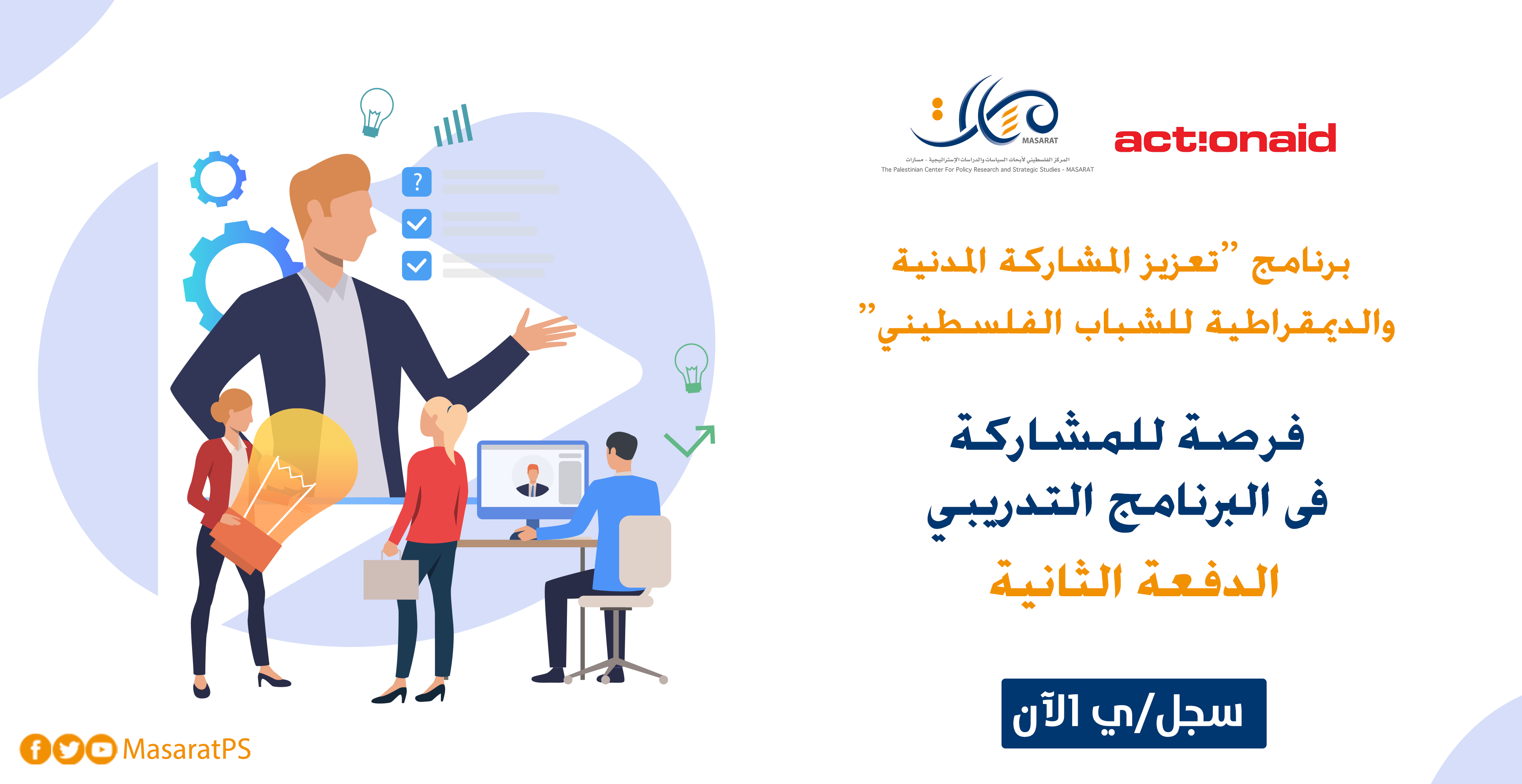سارع إلى تقديم طلب الالتحاق بالدفعة الثانية من برنامج "تعزيز المشاركة المدنية والديمقراطية للشباب الفلسطيني"، الذي ينفذه المركز الفلسطيني لأبحاث السياسات والدراسات الإستراتيجية – مسارات، بالتعاون مع مؤسسة آكشن إيد – فلسطين، وذلك من خلال رابط التسجيل bit.ly/3dudXjV
