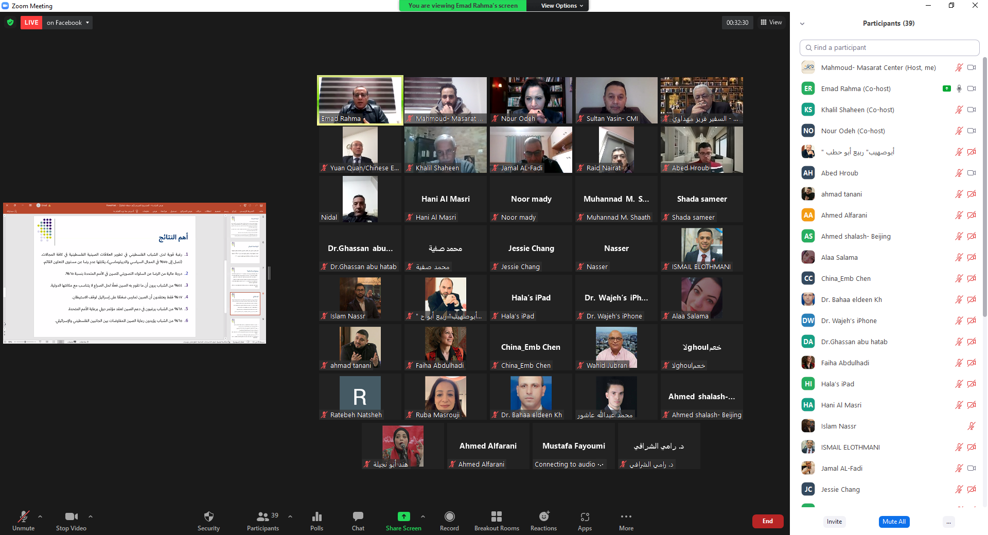 وعرض د. عماد أبو رحمة، المستشار في مركز مسارات، الدراسة التي تقع في 92 صفحة من القطع الكبير، وعقّب عليها كل من: السفير فريز مهداوي، سفير دولة فلسطين لدى جمهورية الصين الشعبية، والسيد يوان قوان، رئيس القسم السياسي في السفارة الصينية، فيما أدارت الحوار نور عودة، الكاتبة والمحللة السياسية.